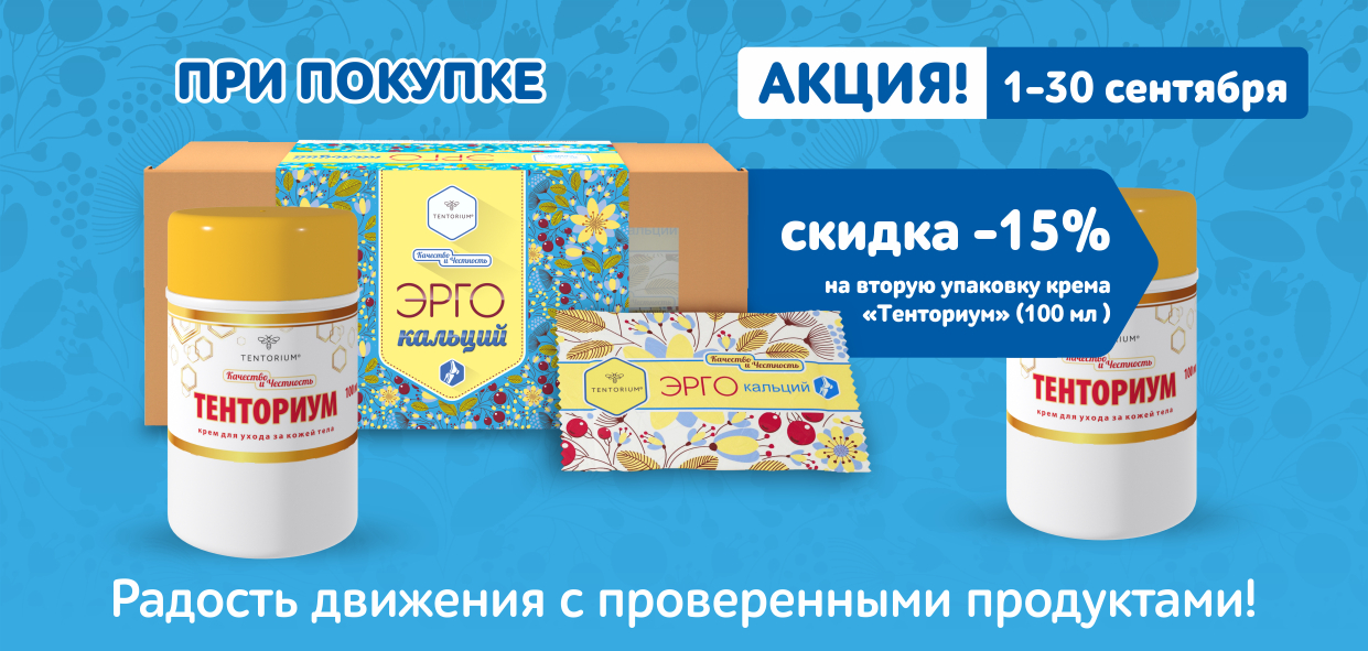 Живи в движении До 30 сентября при покупке БАДа «ЭРГО кальций» и крема «Тенториум» вы получаете скидку 15% на вторую…