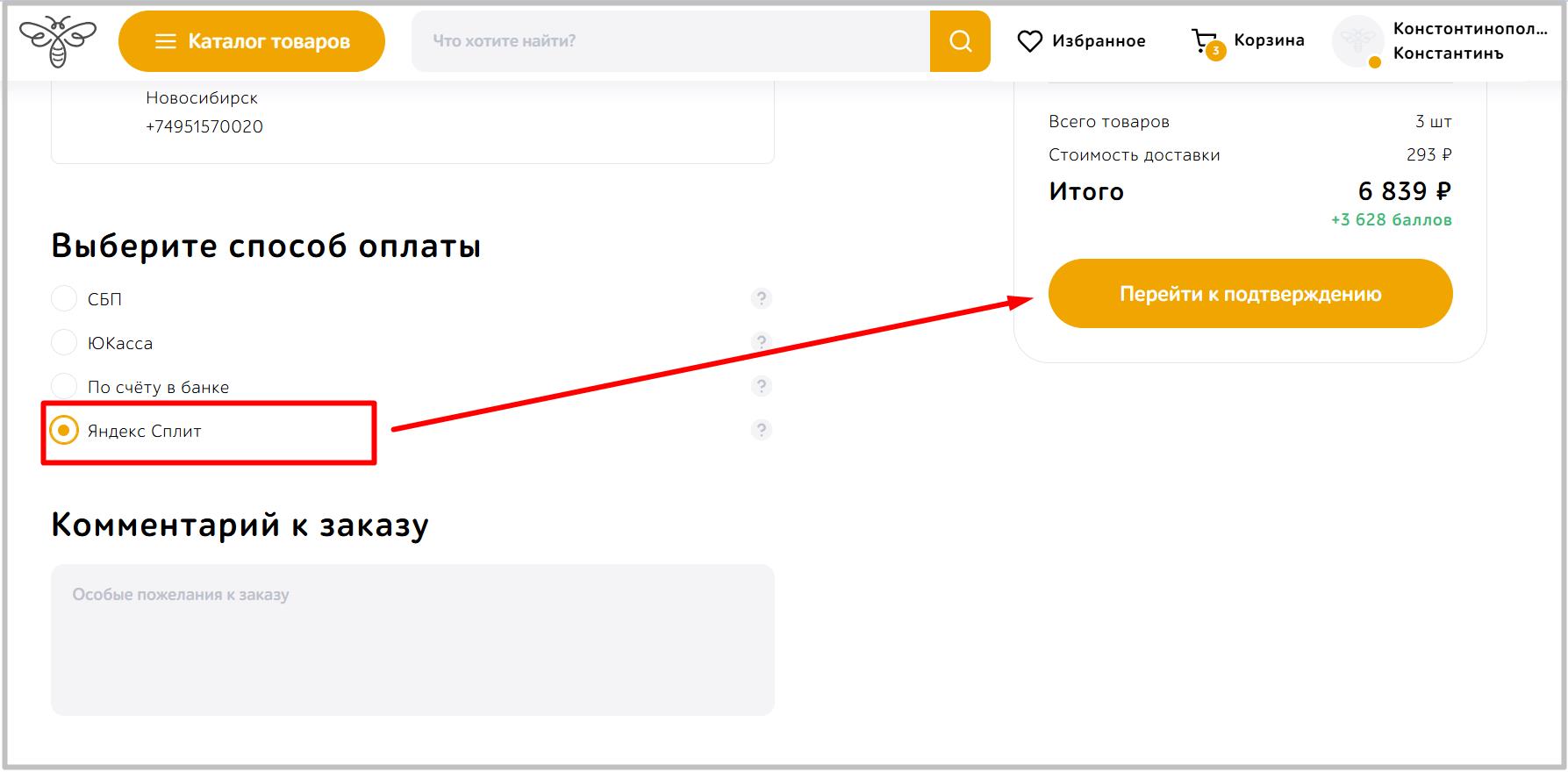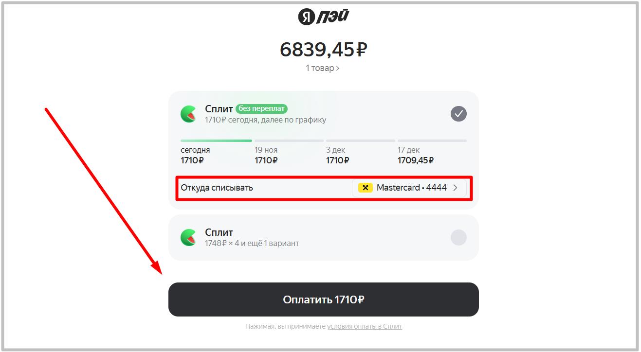 Шаг 2. Выберите способ оплаты Яндекс Сплит и перейдите к подтверждению.
