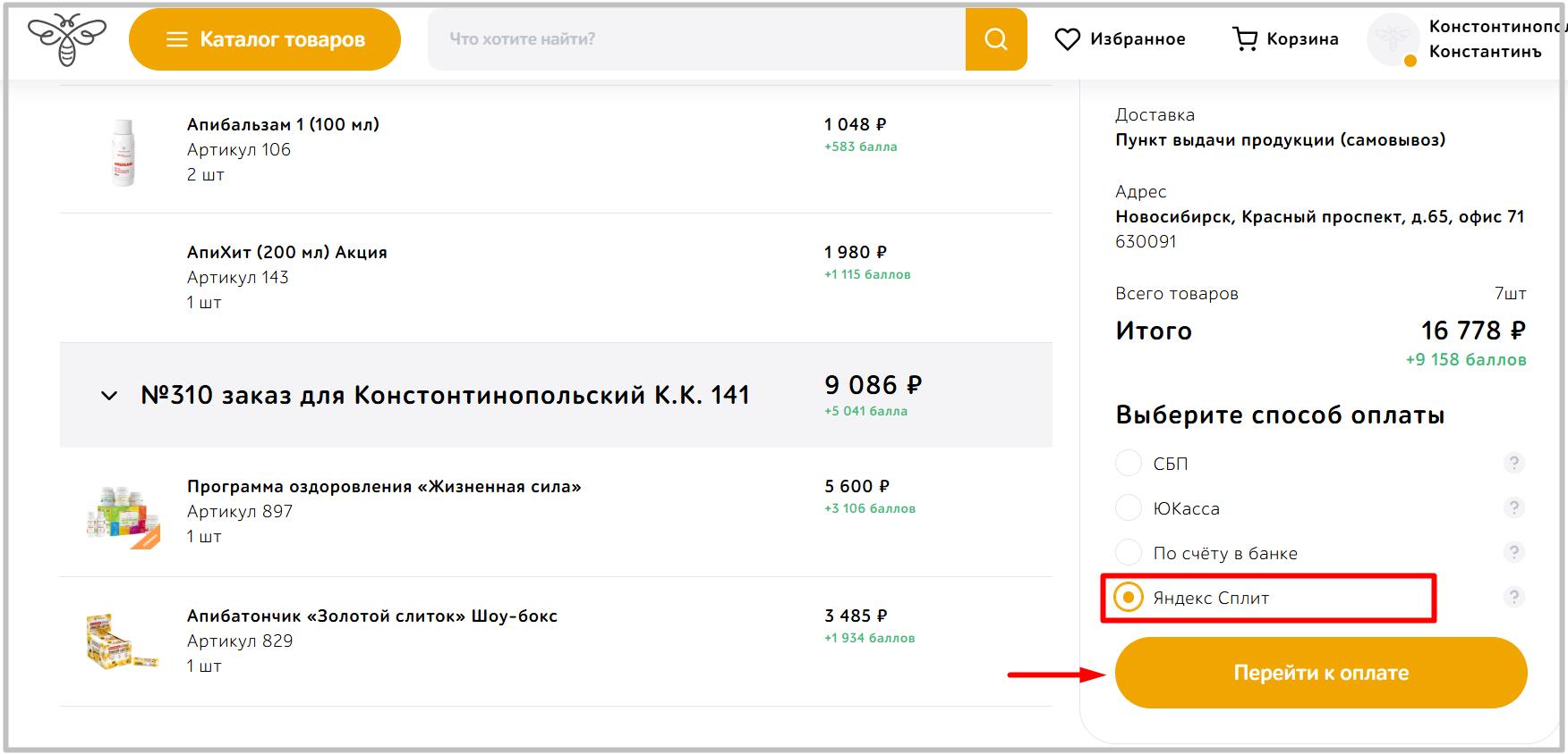 Уточнение. Если вы в консолидированном заказе, то выберите способ оплаты Яндекс Сплит и перейдите к оплате.