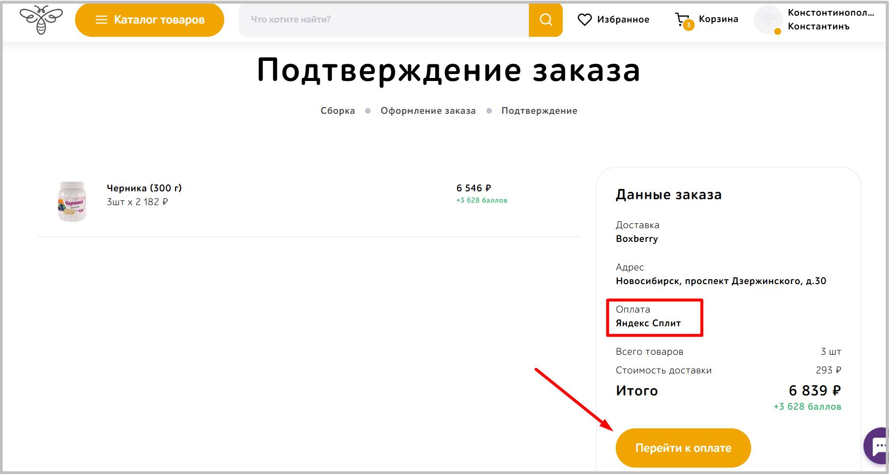 Так выглядит страница с оплатой через Яндекс Сплит.
