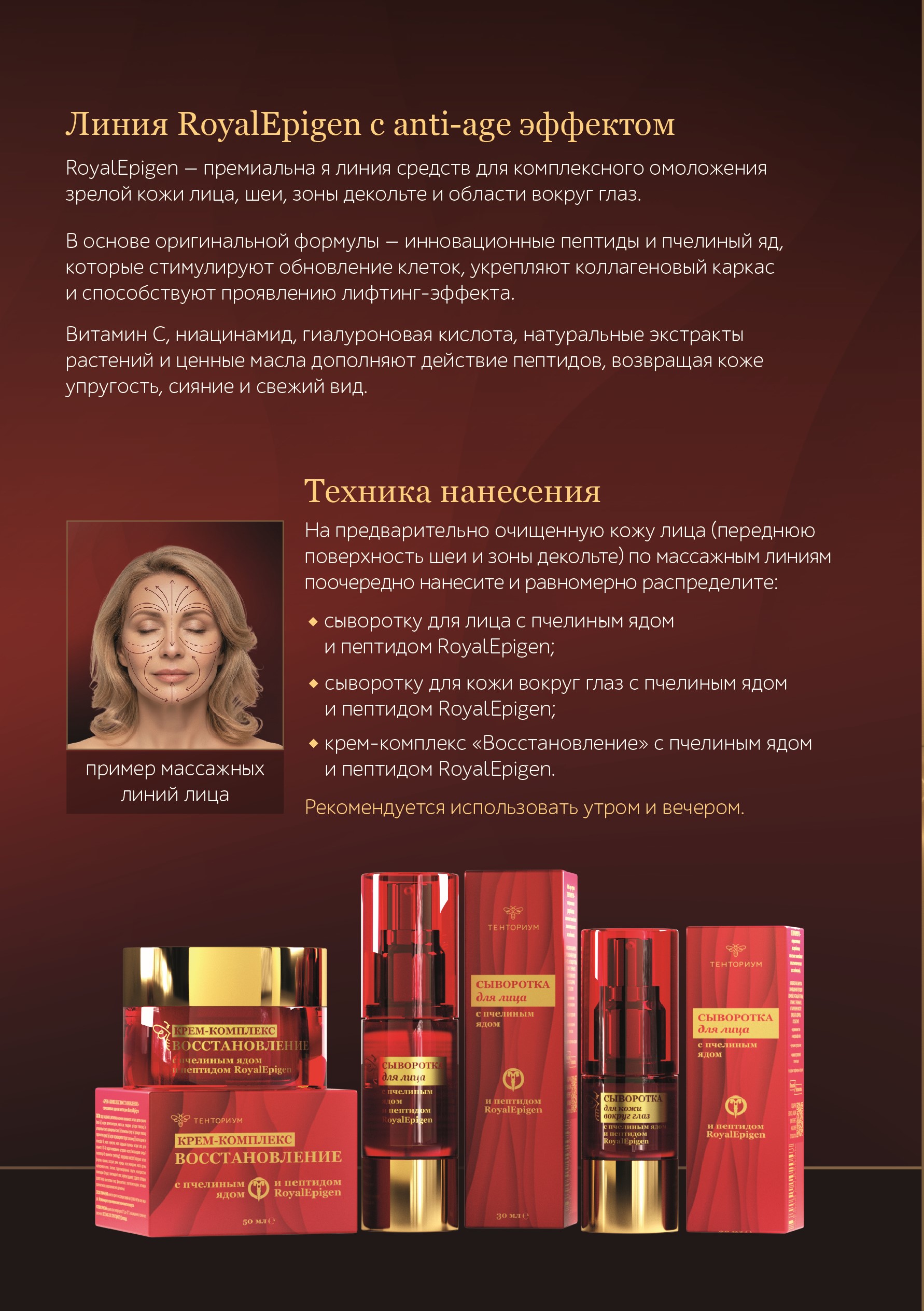 Набор включает три флагманских продукта обновлённой пептидной линии RoyalEpigen: сыворотку для кожи вокруг глаз с эффектом био-ботокса, осветляющую и омолаживающую сыворотку для лица, а также крем-комплекс "Восстановление" для упругости и чёткого овала.