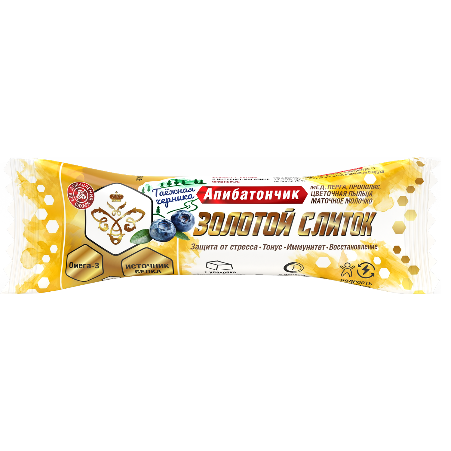 Апибатончик «Золотой слиток. Таёжная черника» обеспечит быструю подзарядку и поддержку зрения. Этому способствуют два новых компонента – ягоды черники в начинке и какао в глазури.