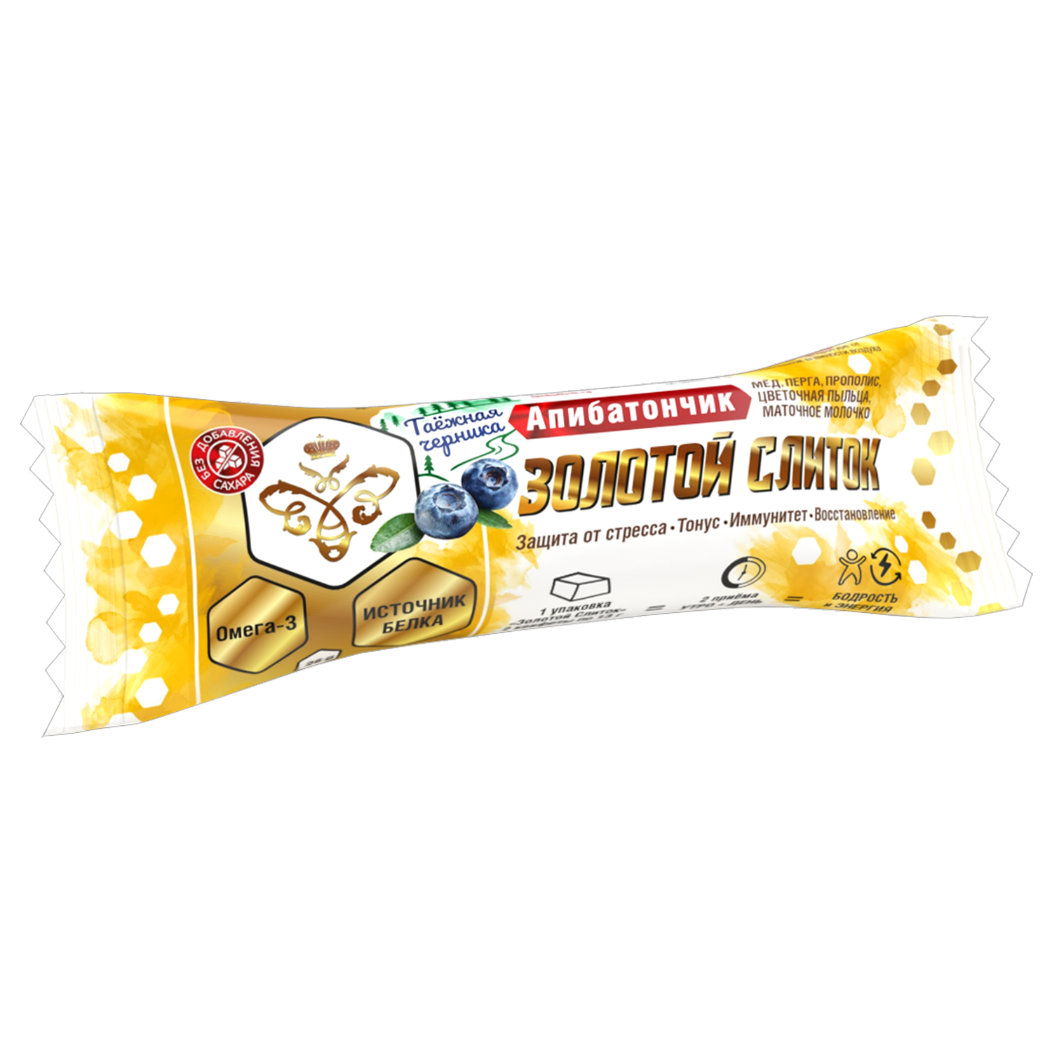 Апибатончик «Золотой слиток. Таёжная черника» обеспечит быструю подзарядку и поддержку зрения. Этому способствуют два новых компонента – ягоды черники в начинке и какао в глазури.