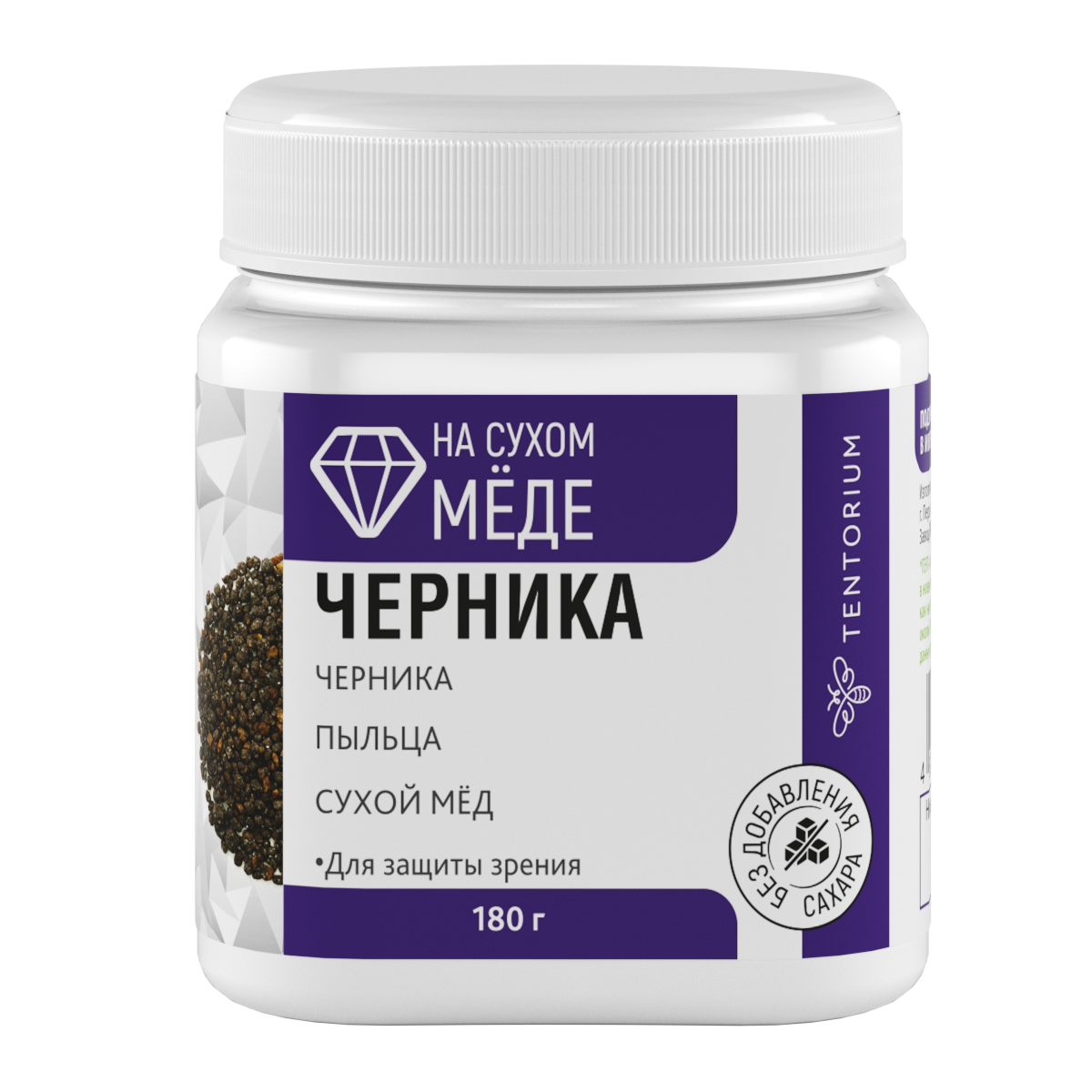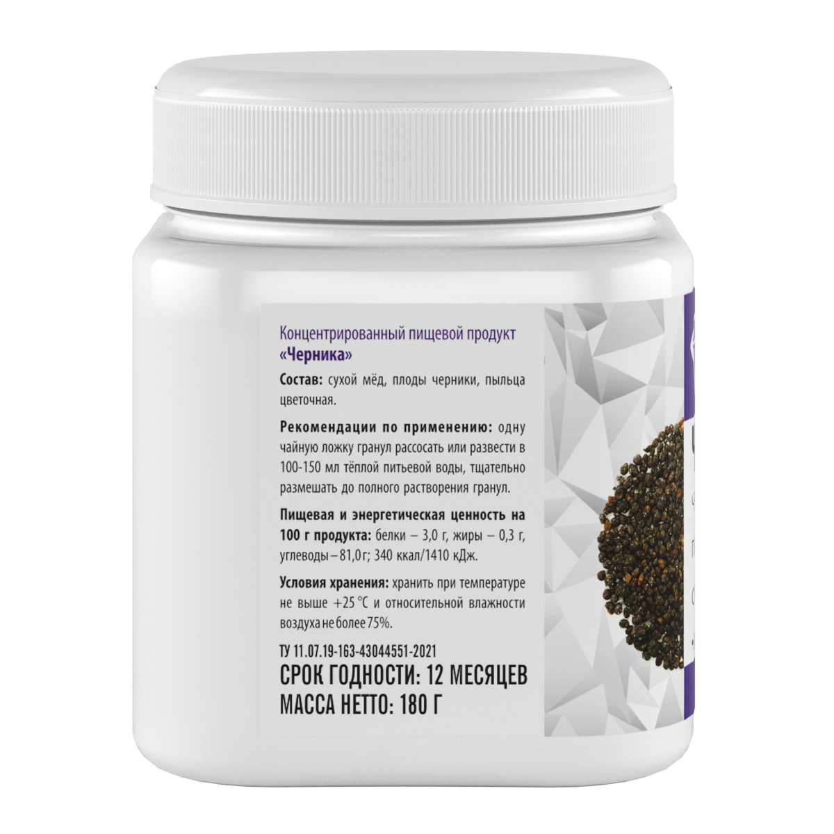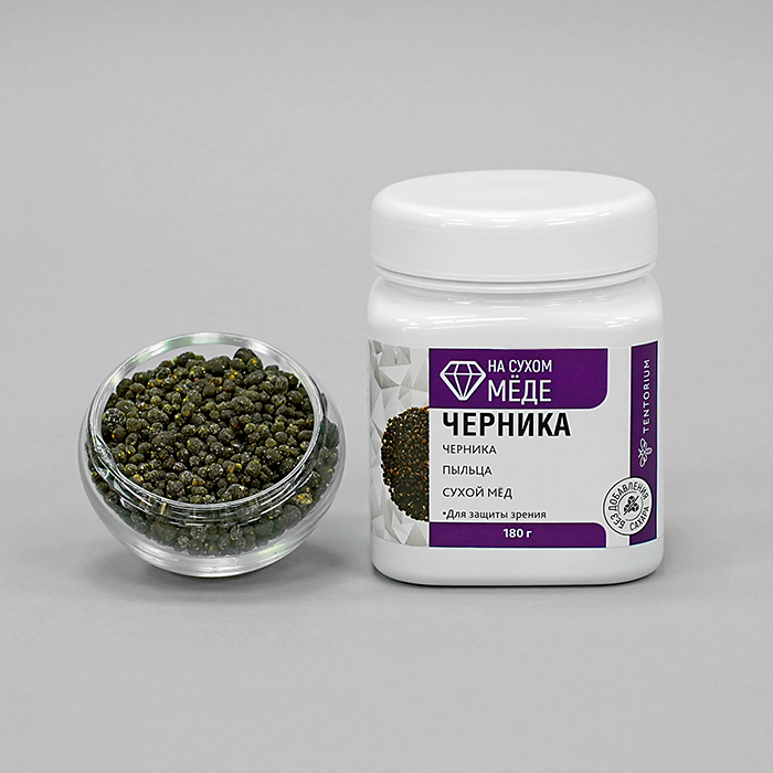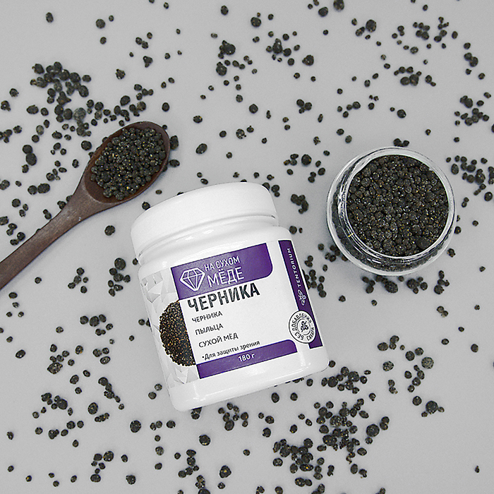 Продукт объединил в себе полезные свойства ягод черники, пчелиной обножки и сухого мёда.