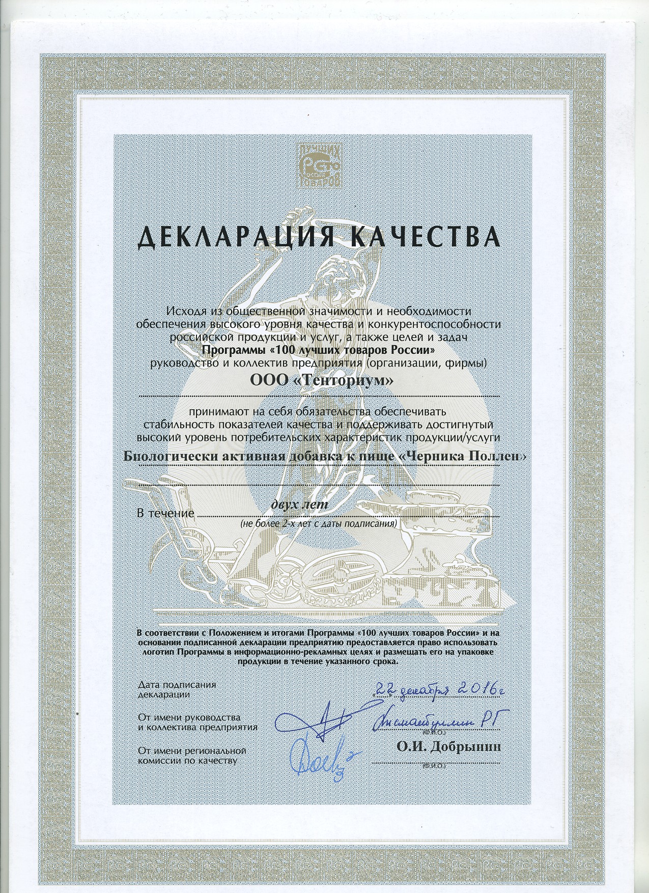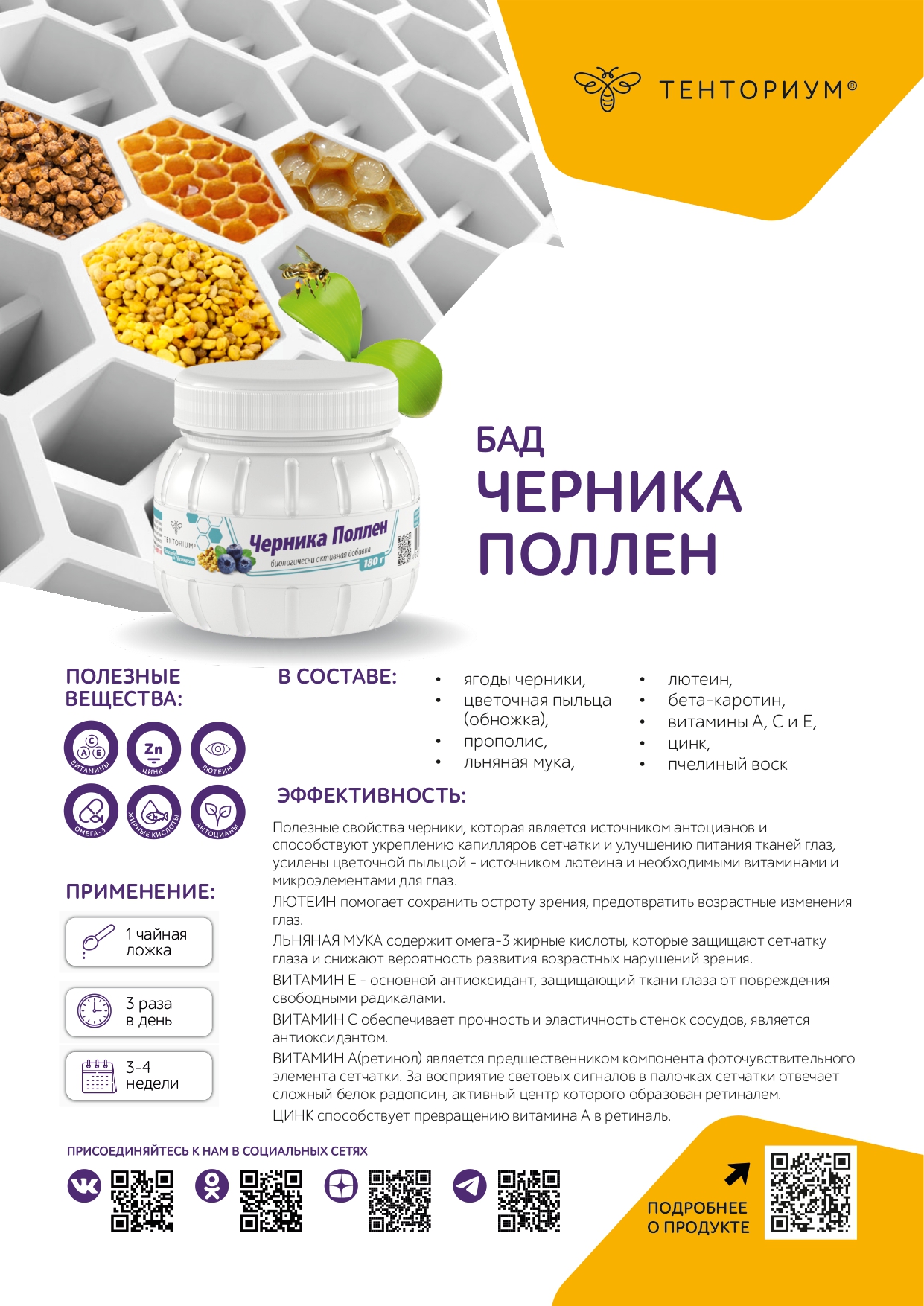 В соответствии с обязательными требованиями российского законодательства биологически активные добавки к пище ТЕНТОРИУМ® реализуются исключительно для личных целей и не подлежат последующей перепродаже. "Черника Поллен" является биологически активной добавкой к пище и не является лекарственным средством. Перед употреблением рекомендуется проконсультироваться с врачом. Имеются противопоказания. Биологически активная добавко прошла государственную регистрацию и имеет свидетельство о государственной регистрации №RU.77.99.11.003.E.005302.11.16 от 15.11.2016 г.