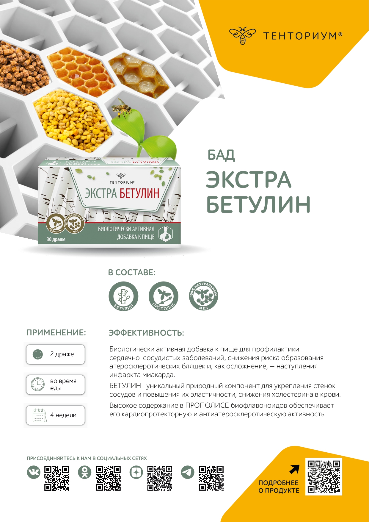 Эффективность продукта обеспечивают уникальные природные компоненты – бетулин и прополис. Содержащиеся в прополисе вещества – биофлавоноиды – разжижают кровь, улучшают состояние капилляров и сосудов. Бетулин – вещество, которое производят из бересты – меняет механизм усвоения жиров печенью, что приводит к снижению холестерина в крови и количество «атеросклеротических бляшек» в сосудах. Совместное применение бетулина и прополиса усиливает эффект обоих веществ, способствует поддержанию нормального уровня холестерина в крови и укреплению стенок сосудов.