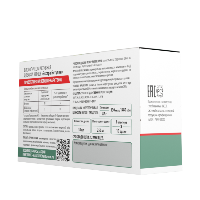В соответствии с обязательными требованиями российского законодательства биологически активные добавки к пище ТЕНТОРИУМ® реализуются исключительно для личных целей и не подлежат последующей перепродаже. "Экстра Бетулин" является биологически активной добавкой к пище и не является лекарственным средством. Перед употреблением рекомендуется проконсультироваться с врачом. Имеются противопоказания. Биологически активная добавка прошла государственную регистрацию и имеет свидетельство о государственной регистрации №RU.77.99.88.003.E.005195.11.16 от 09.11.2016 г.