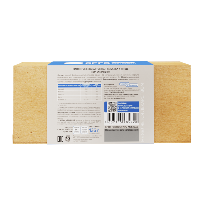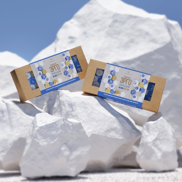 В "ЭРГО кальции" объединена природная сила двух видов кальция исключительно натурального происхождения. Первый получают из экологически чистых перепелиных яиц от племенных перепёлок с собственного агрокомплекса ТЕНТОРИУМ. Скорлупа перепелиных яиц, помимо кальция, содержит медь, фтор, железо, марганец, молибден, фосфор, серу, цинк, кремний и другие — всего 27 элементов! Второй природный минеральный компонент для "ЭРГО кальция" — фосфат кальция — ценный источник фосфора и кальция в оптимальных пропорциях, необходимых для усвоения кальция костной тканью.