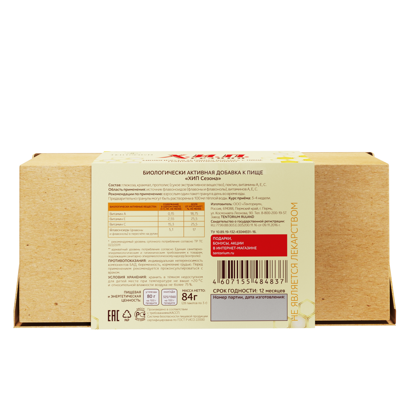 В соответствии с обязательными требованиями российского законодательства биологически активные добавки к пище ТЕНТОРИУМ® реализуются исключительно для личных целей и не подлежат последующей перепродаже. "Х.И.П. Сезона" является биологически активной добавкой к пище и не является лекарственным средством. Перед употреблением рекомендуется проконсультироваться с врачом. Имеются противопоказания. Биологически активная добавка прошла государственную регистрацию и имеет свидетельство о государственной регистрации №RU.77.99.88.003.E.005200.11.16 от 09.11.2016 г.