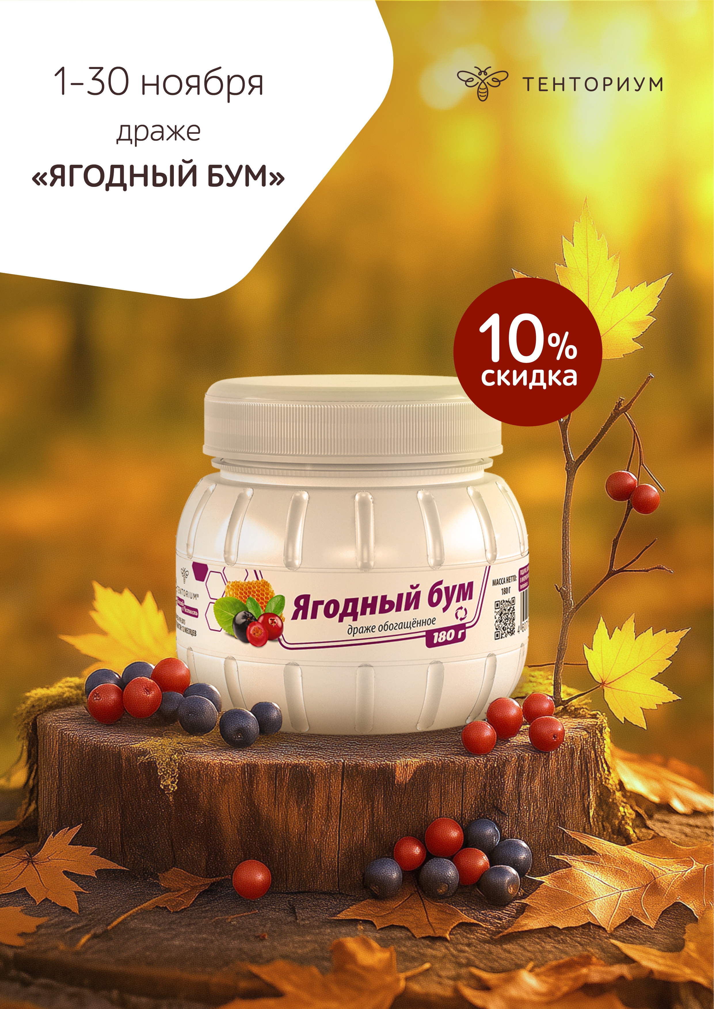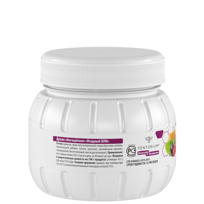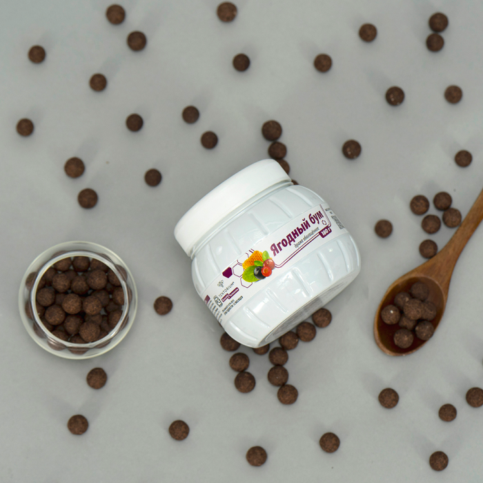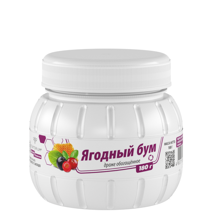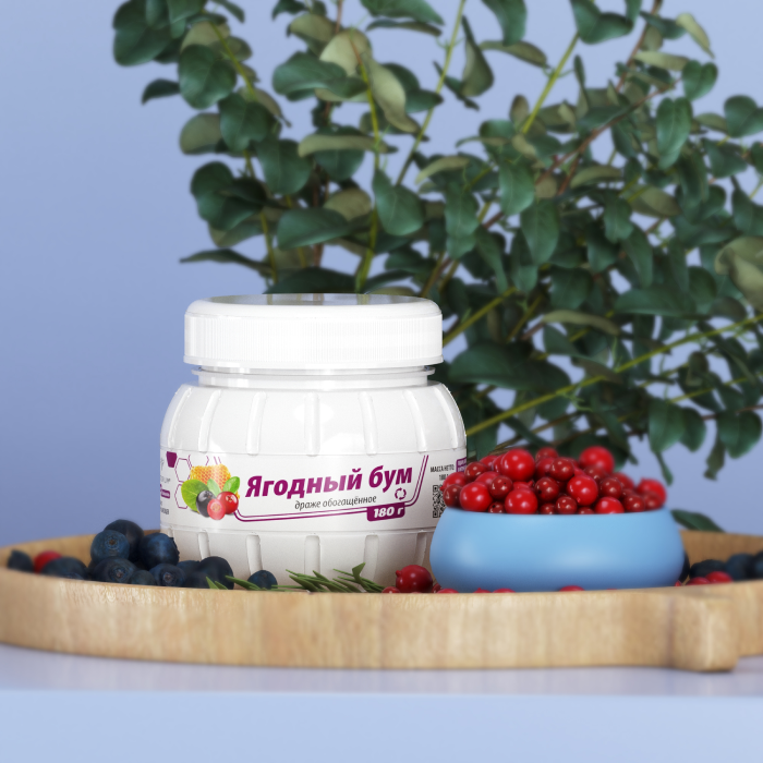 Ягоды брусники, клюквы, черноплодной рябины обработаны и высушены по специальной технологии, позволяющей максимально сохранить концентрацию полезных веществ. Естественный кислый вкус ягод в драже компенсируется повышенным содержанием мёда, который делает продукт мягким при разжёвывании и вкусным, при этом проявляя иммуностимулирующее действие. «Ягодный бум» объединил полезные свойства «зимних» ягод, мёда и прополиса, многократно усилив их витаминным комплексом, поэтому содержание жизненно важных витаминов – В1, В2, В6, В12, С, D, Е и др. – в драже доведено до физиологически значимых показателей.