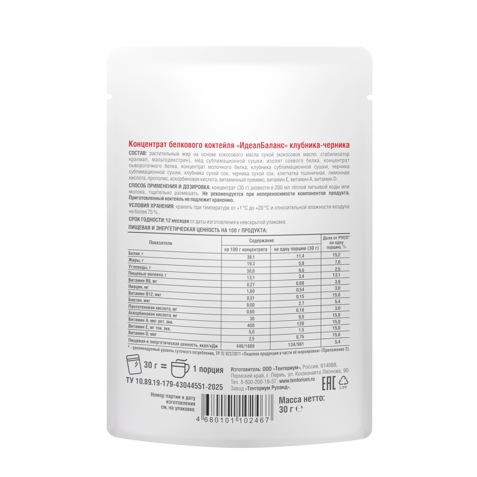 Объём: Масса нетто 30 г (1 порция).