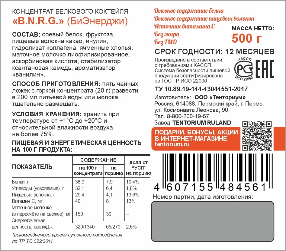 Концентрат белкового коктейля B.N.R.G. Продукты ТЕНТОРИУМ для активной жизни и здоровья.