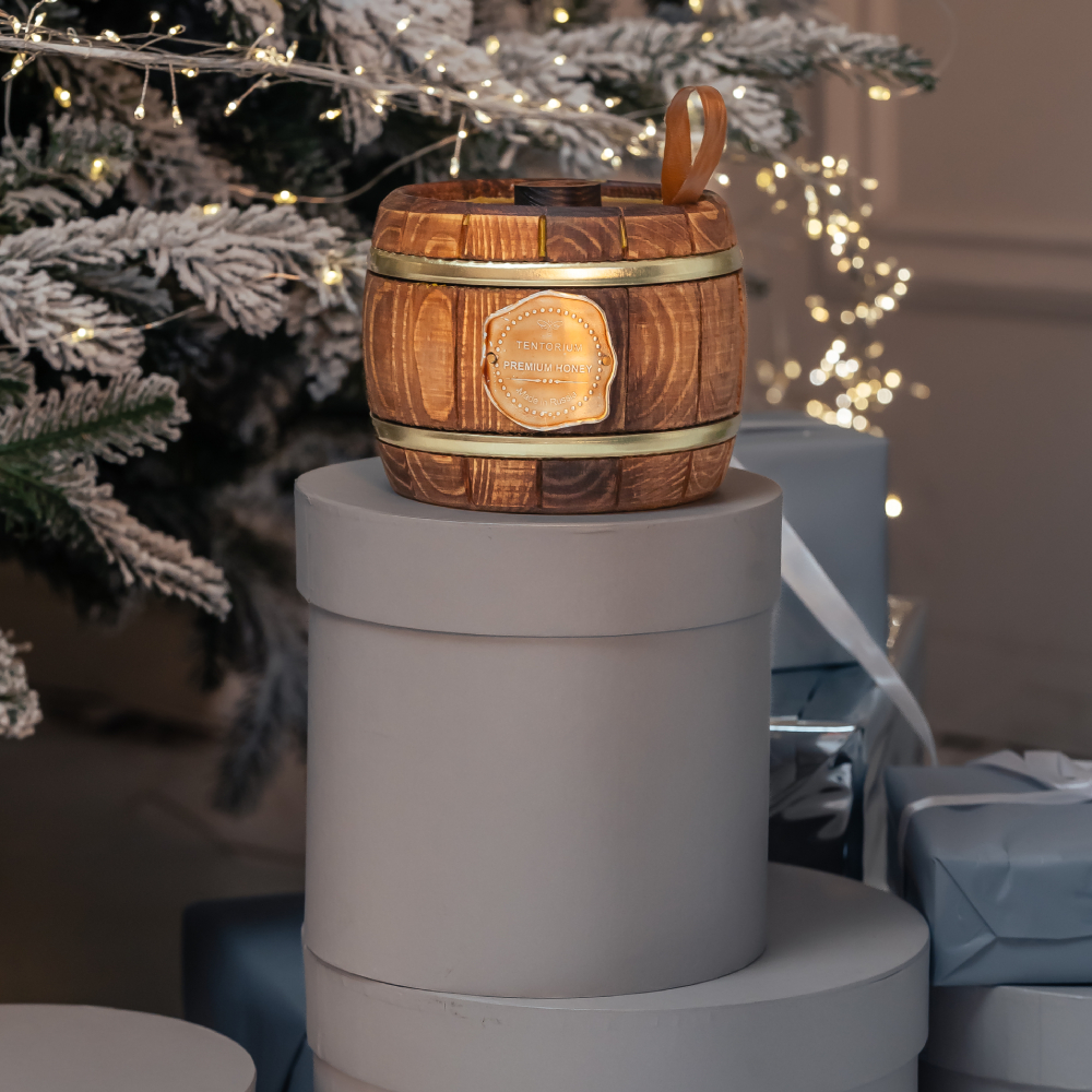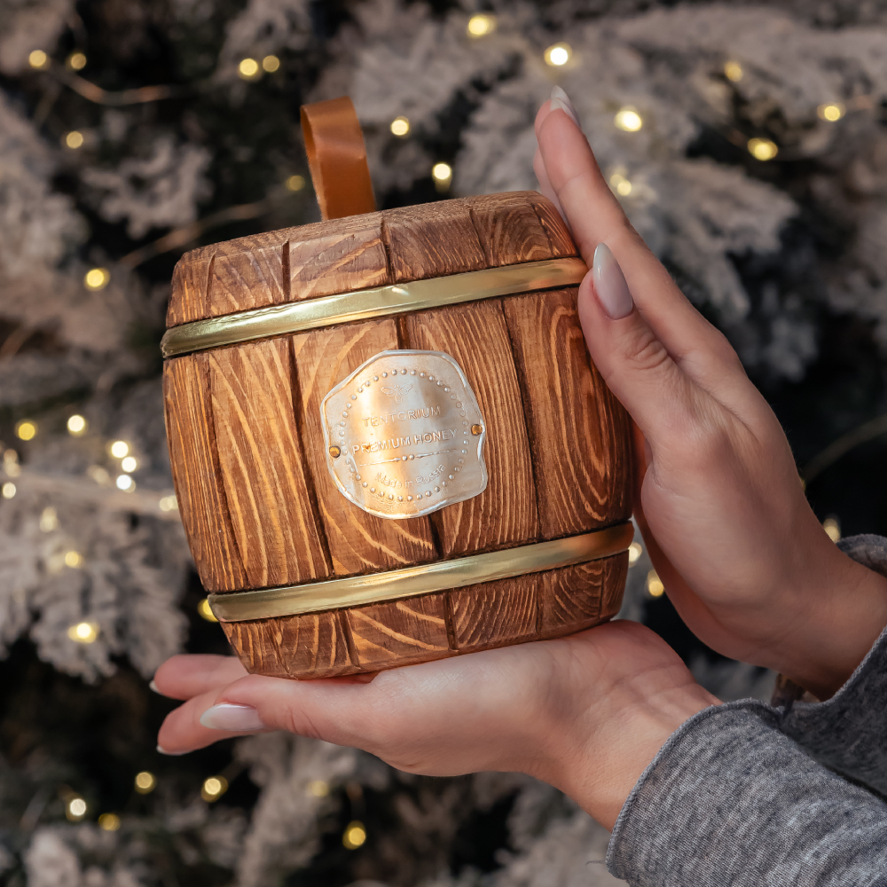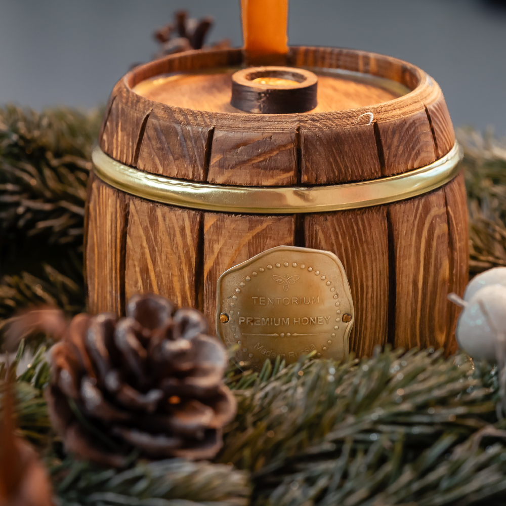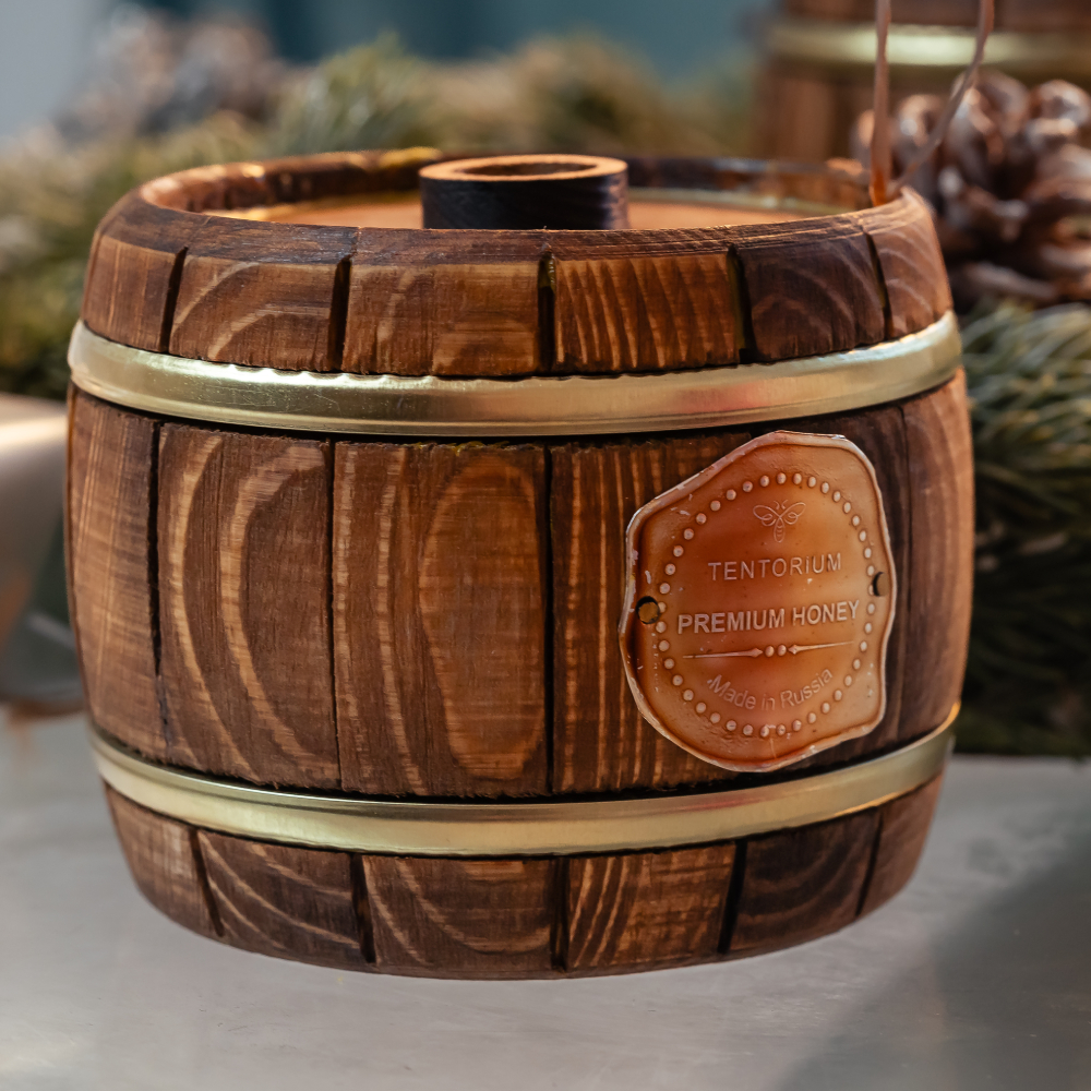 Бочонок ручной работы из древесины хвойных пород способен приумножить целебные свойства мёда за счёт эфирных масел и фитонцидов, положительно влияющих на весь организм. Деревянный бочонок обеспечивает длительное экологичное хранение мёда.
