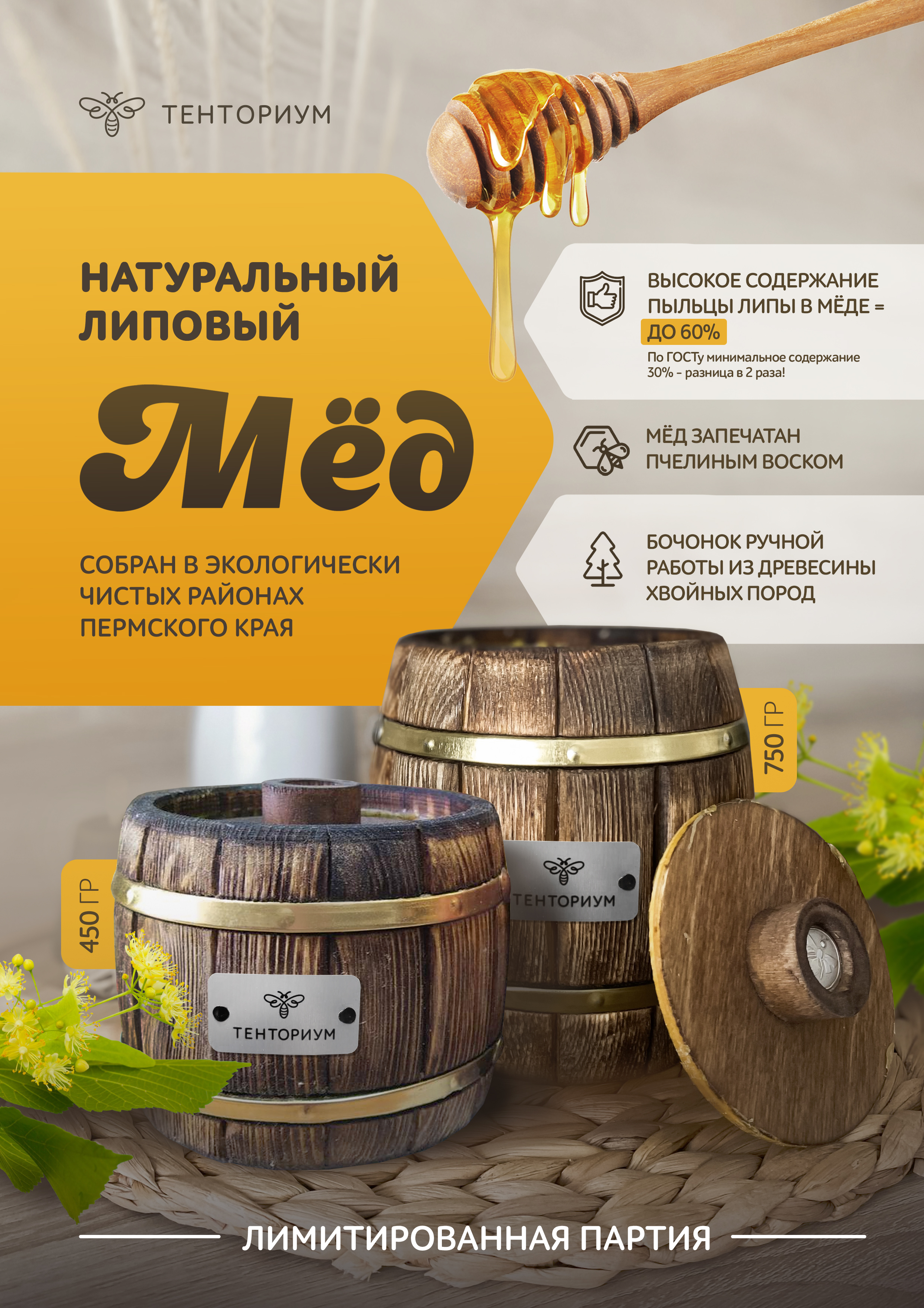 Натуральный липовый мёд собран в экологически чистых районах Пермского края. Мёд пчёл тёмной лесной породы считают элитным: его отличает повышенное содержание биологически активных веществ.