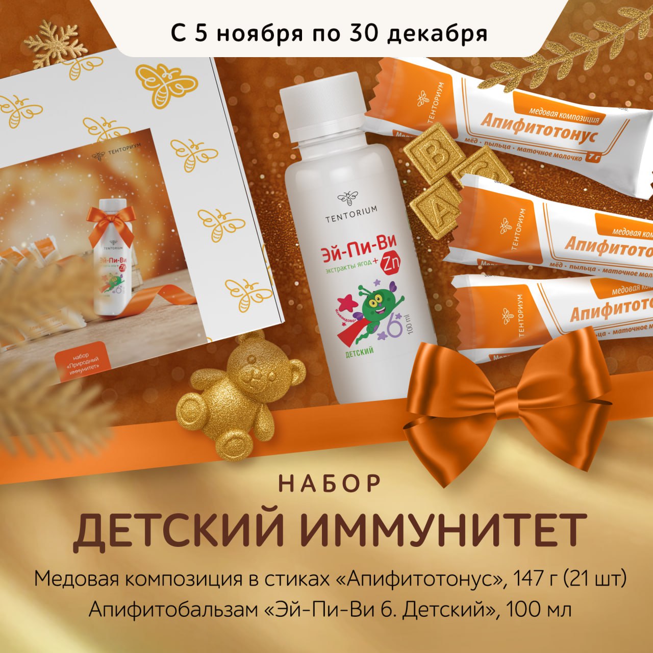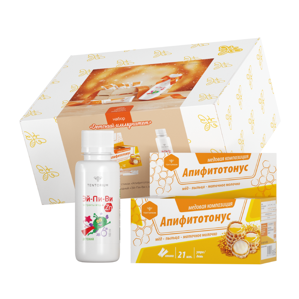 Набор “Детский иммунитет” поможет ребёнку оставаться полным сил и справиться с непростым периодом. В него входят "Эй-Пи-Ви 6. Детский” – надёжный щит от вирусов и бактерий: благодаря сладкому вкусу стевии он понравится даже самым привередливым малышам. И шоу-бокс медовых стиков "Апифитотонус" – быстрый и вкусный способ зарядиться энергией и поднять настроение!