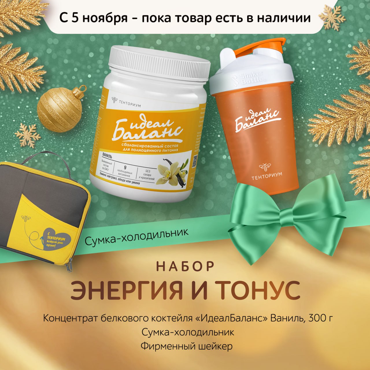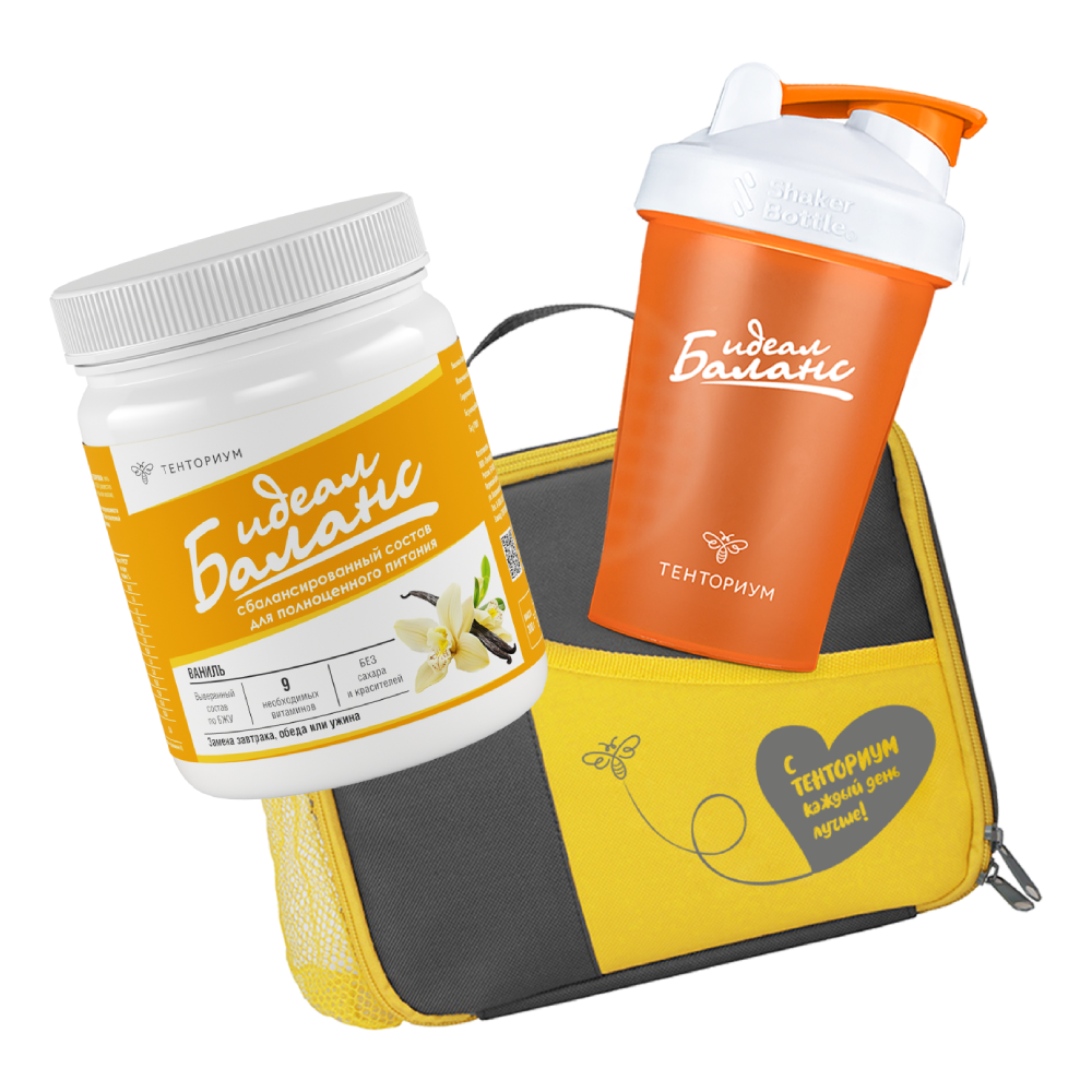 В набор входит: белковый коктейль "ИдеалБаланс" с нежным ванильным вкусом, фирменный шейкер для его лёгкого приготовления и стильная сумка-холодильник, чтобы полезные перекусы и напитки всегда были свежими и под рукой!