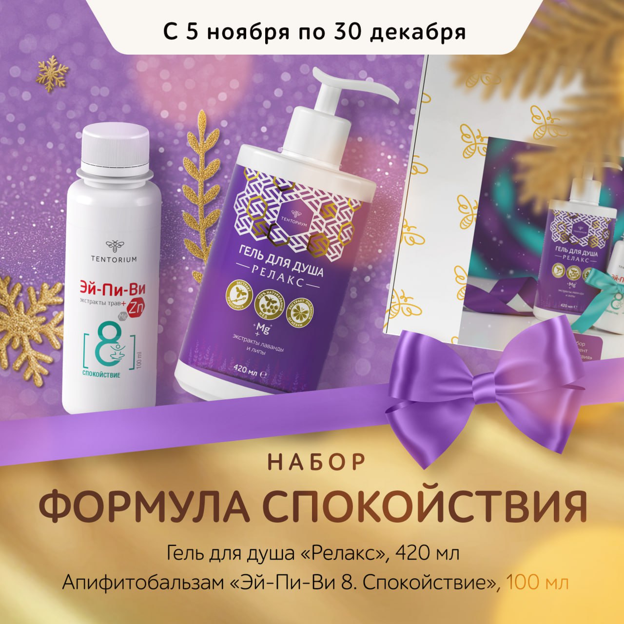 Внутри набора – апифитобальзам “Эй-Пи-Ви. 8 Спокойствие” на основе натуральных пчелопродуктов, целебных растений, магния и цинка для глубокого расслабления и гармонии, а также полноразмерный расслабляющий гель для душа “Релакс” с магнием, успокаивающей лавандой и липой.