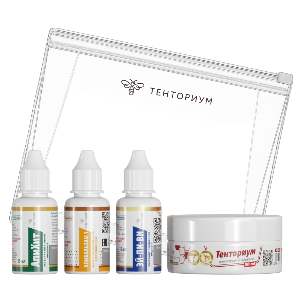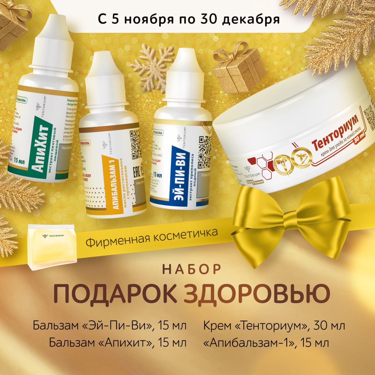 Набор "Подарок здоровью" - настоящая сокровищница природных богатств в удобных мини-форматах. Внутри - народные хиты от “Тенториум”: апифитобальзамы “Эй-Пи-Ви”, “АпиХит”, “Апибальзам-1” и крем "Тенториум". Это верные союзники в защите от вирусов, поддержании здорового пищеварения, избавлении от токсинов и снятии воспалений.