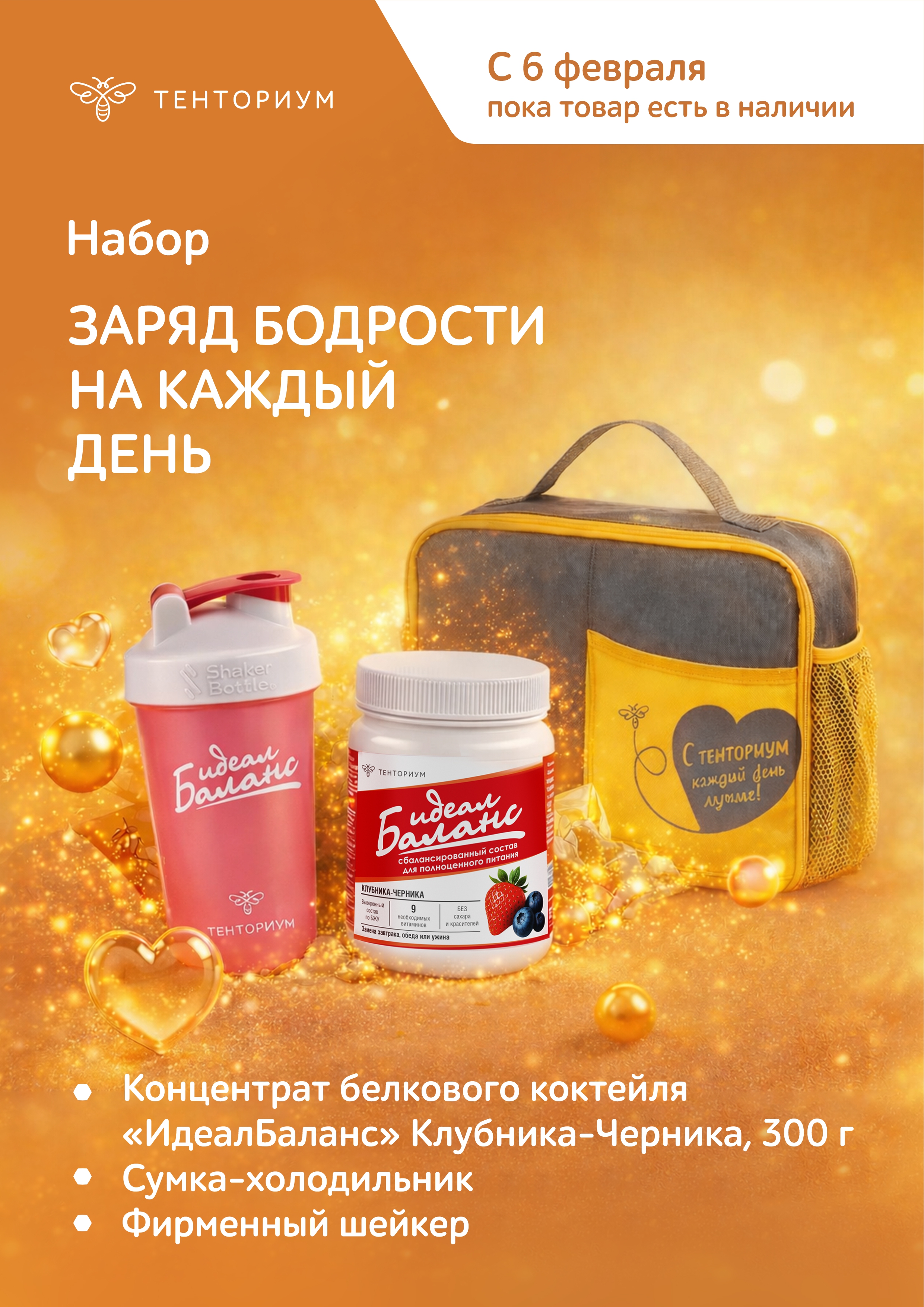 Внутри – сбалансированный белковый коктейль "ИдеалБаланс" со вкусом клубники и черники (300 г) и эргономичный шейкер, который позволит приготовить напиток за считанные секунды!