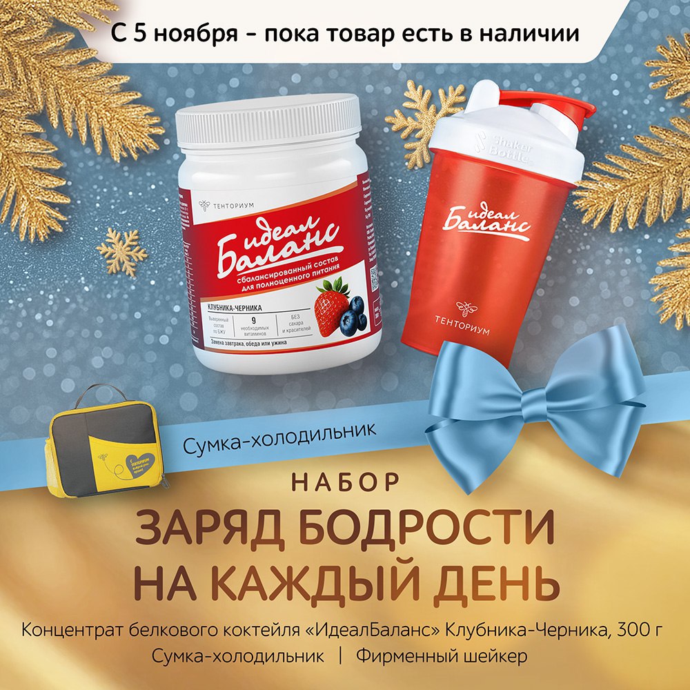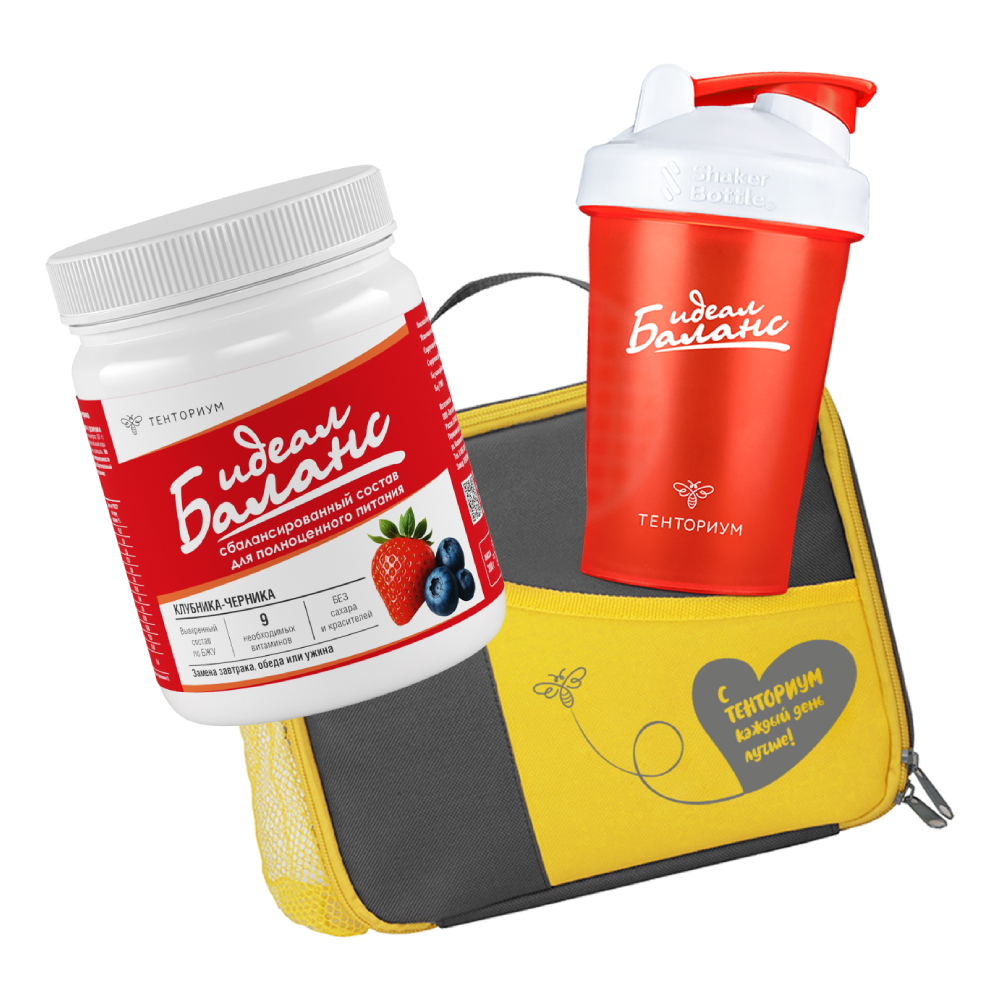 Внутри – всё необходимое для поддержания сил и отличного самочувствия: белковый коктейль "ИдеалБаланс" с восхитительным вкусом клубники и черники, удобный фирменный шейкер для быстрого приготовления и компактная сумка-холодильник, которая сохранит коктейль, фрукты или йогурт свежими в течение дня.