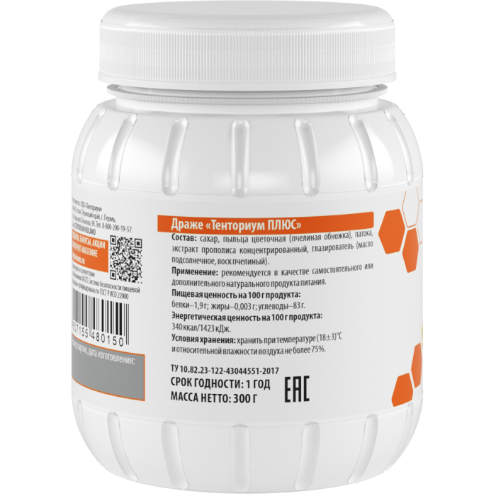 Прополис способствует укреплению естественной защиты организма, оказывает противовоспалительное действие. В сочетании с прополисом входящая в состав драже «Тенториум Плюс» витаминизированная пыльца укрепляет иммунитет, способствует нормализации обменных процессов и сердечной деятельности, улучшает состав крови и работу пищеварительной системы, замедляет процессы старения. Эти свойства активных компонентов делают драже незаменимым общеукрепляющим средством.